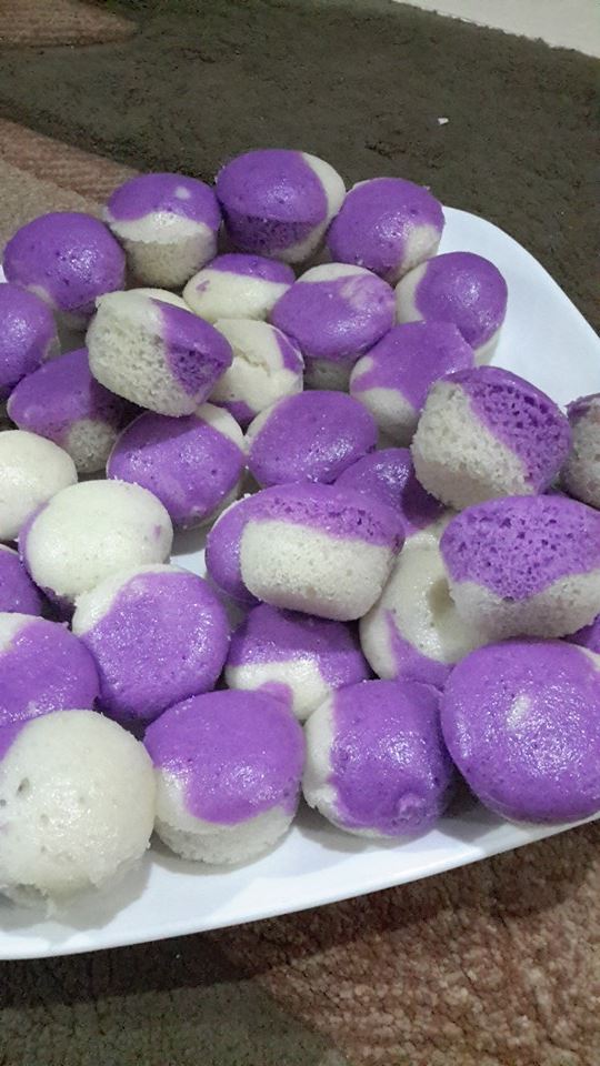 Mula2 kisar nasi.. Gula.. Air/ dlm blender Masukan tepung gandum dn beras…. Masukan Yis dan Soda. Perap selama 3 jam.. Bahagi kepada 2 warna pilihan.. Putih esen vanila Purple keladi paste.. (Salah 1 je letak perasa.. Jangan ke2nya tau.. Kukus selama 15 minit. .