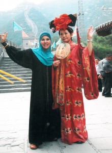 Bersama wanita jepun sedang mengenakan pakaian tradisional wanita cina di tembok besar cina.