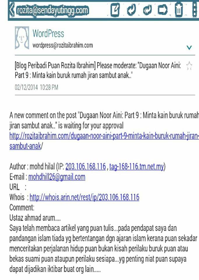 Alhamdullilah berjawab sudah pertanyaan sy ttg isu teguran rakan pembaca blog mengenai tulisan sy “Dugaan Noor Aini”… Setelah merujuk kepada beberapa org ulama .. Ini antara perbualan sy/staf dengan beberapa ulama (3 org) yg sy rujuk menerusi perbualan telefon.. Whats up & email.. Sy ingin melihat berbagai pendapat.. Menilai dari berbagai sudut ..