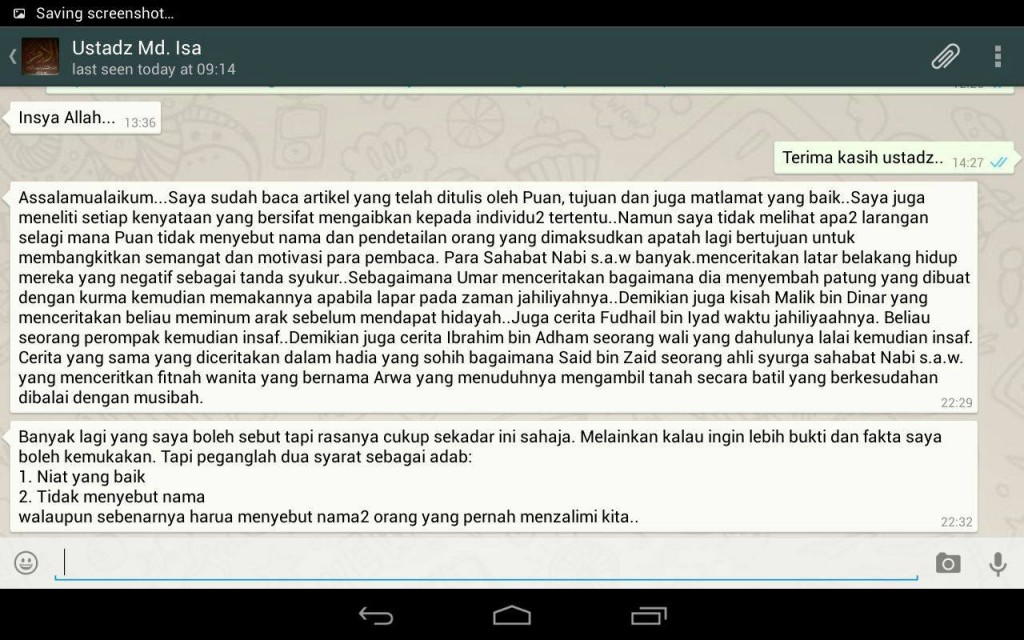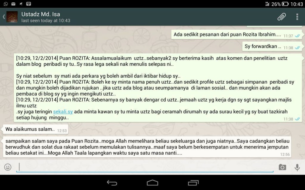Antara mesej yang di sampaikan Ustaz Md. Isa mengenai penulisan blog saya.